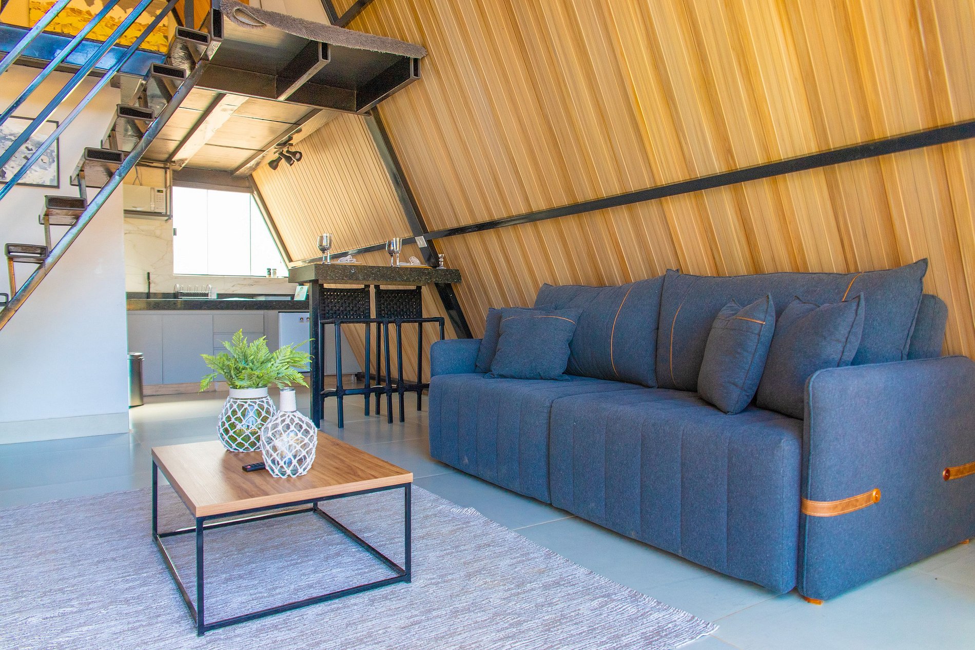 Dentro da cabana, ambientes acolhedores garantem praticidade: sala para relaxar, varanda para contemplar o verde e uma cozinha equipada com utensílios essenciais para preparar momentos simples e especiais.