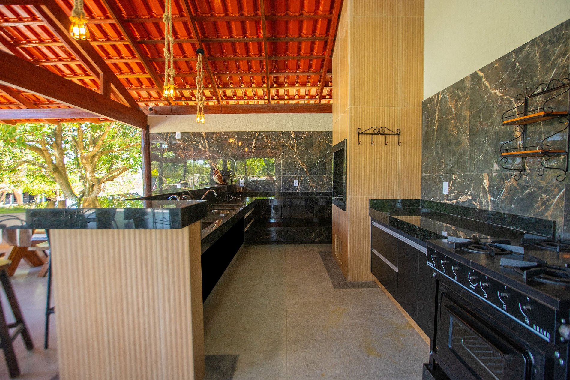 A charmosa varanda é ideal para reunir a família e os amigos com conforto. A estrutura conta com cozinha completa, equipada com micro-ondas, fogão e forno industriais, geladeira, freezer e cervejeira, além de uma área gourmet com churrasqueira para preparar refeições inesquecíveis.