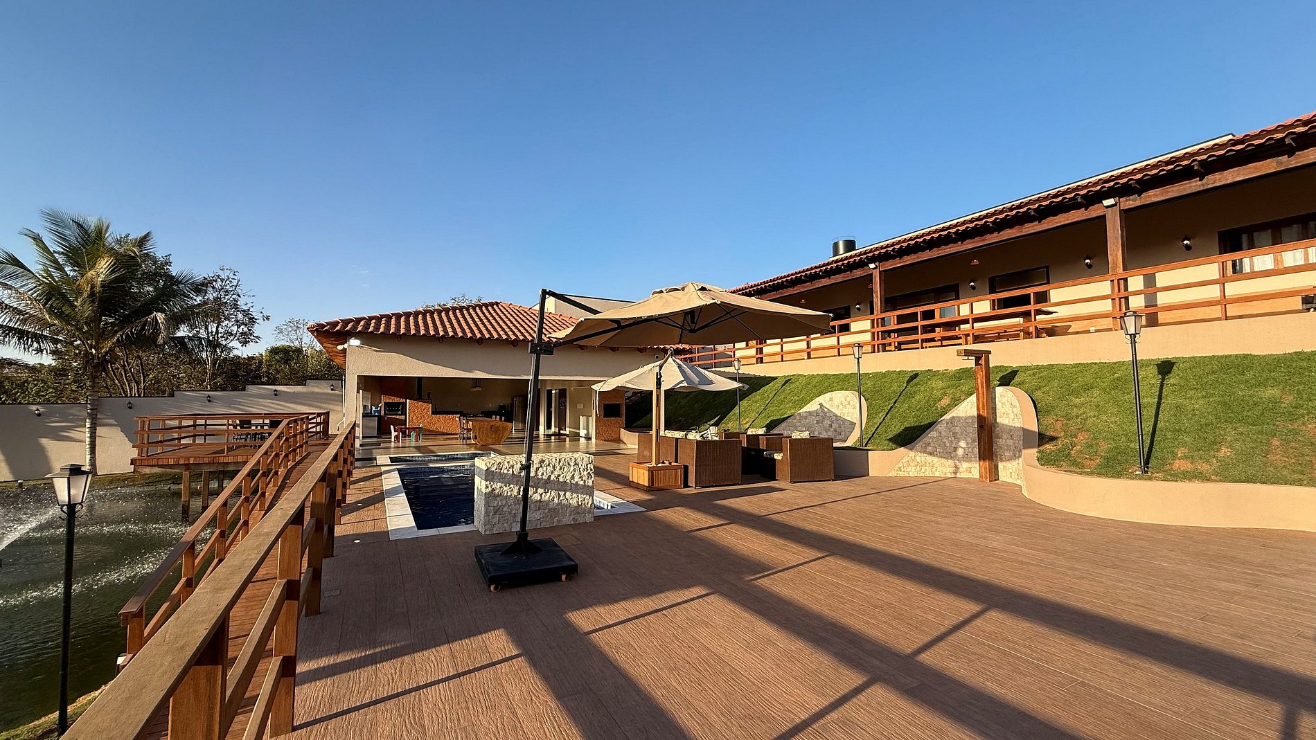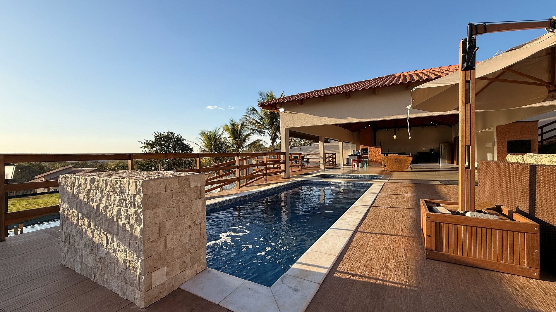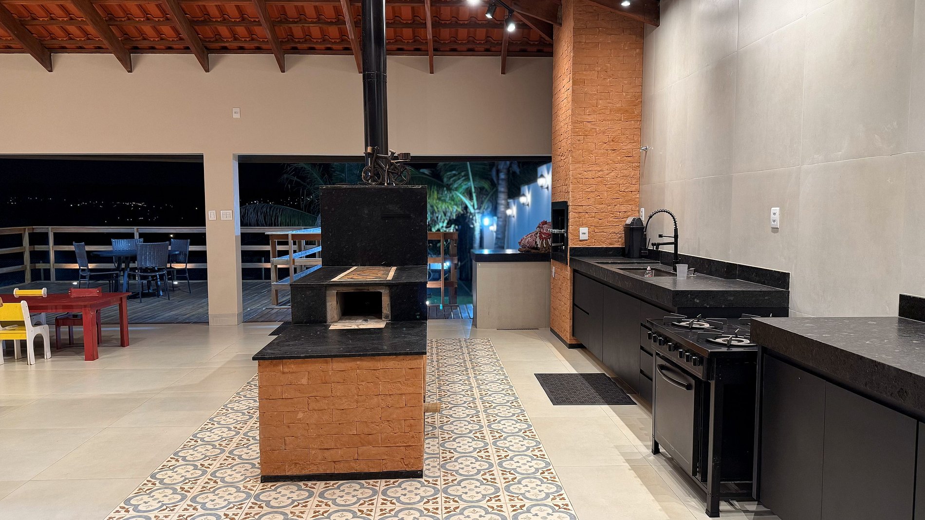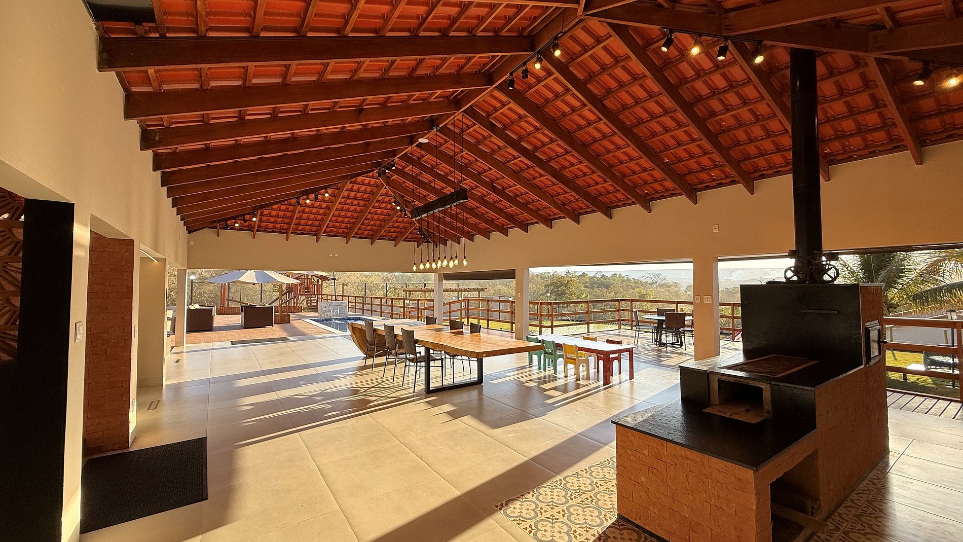 Ao lado da área gourmet, o deck se abre para uma vista panorâmica de tirar o fôlego, com o Lago Corumbá e a cidade de Caldas Novas ao fundo – cenário perfeito para refeições ao ar livre e bons momentos em grupo. O espaço gourmet é amplo e completo: conta com churrasqueira com espetos e grelha, fogão a lenha e industrial, forno, freezer, geladeiras, mesas grandes (inclusive infantil), poltronas e ombrelones. Tudo pensado para proporcionar conforto, praticidade e integração entre os hóspedes.