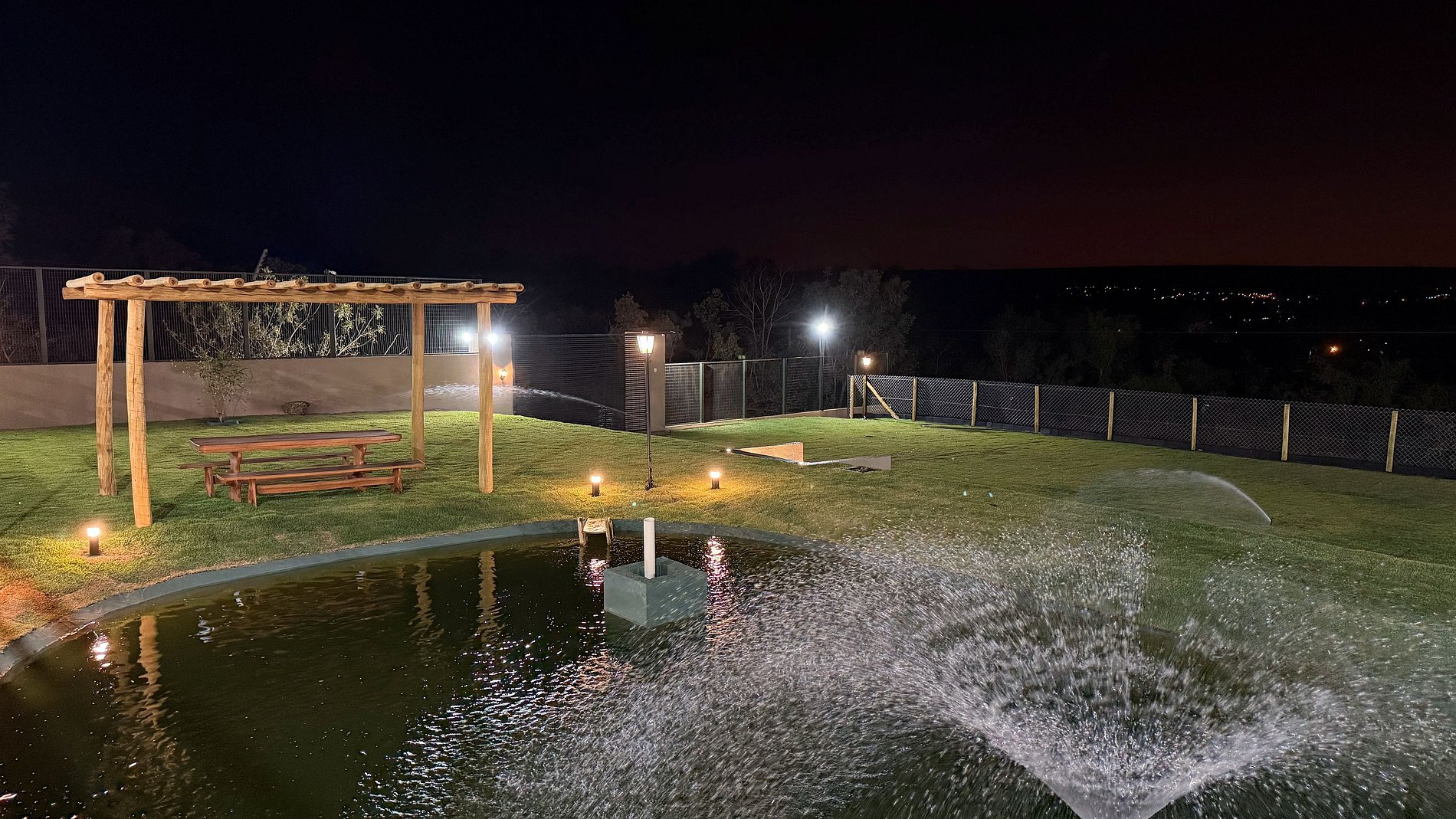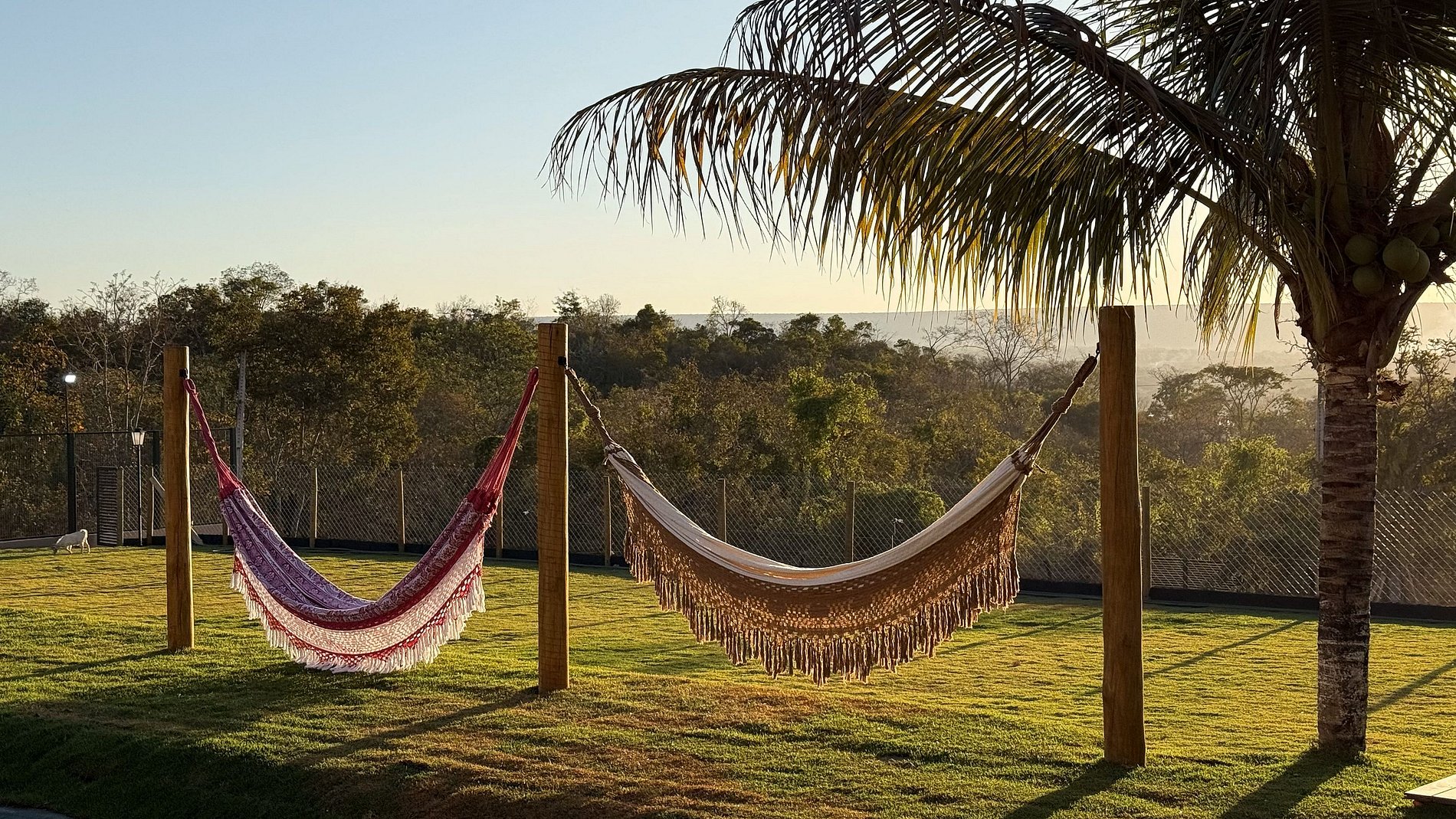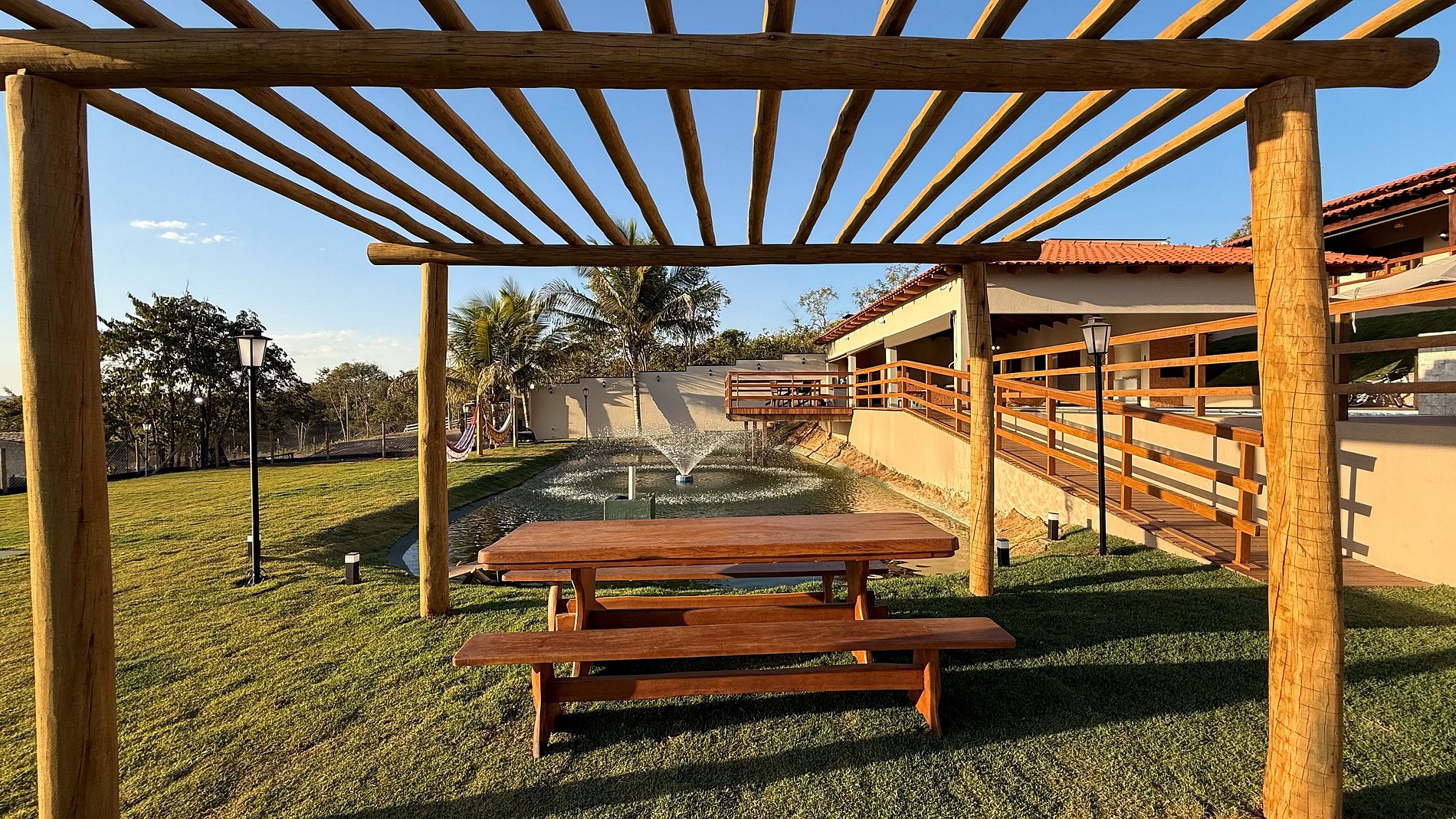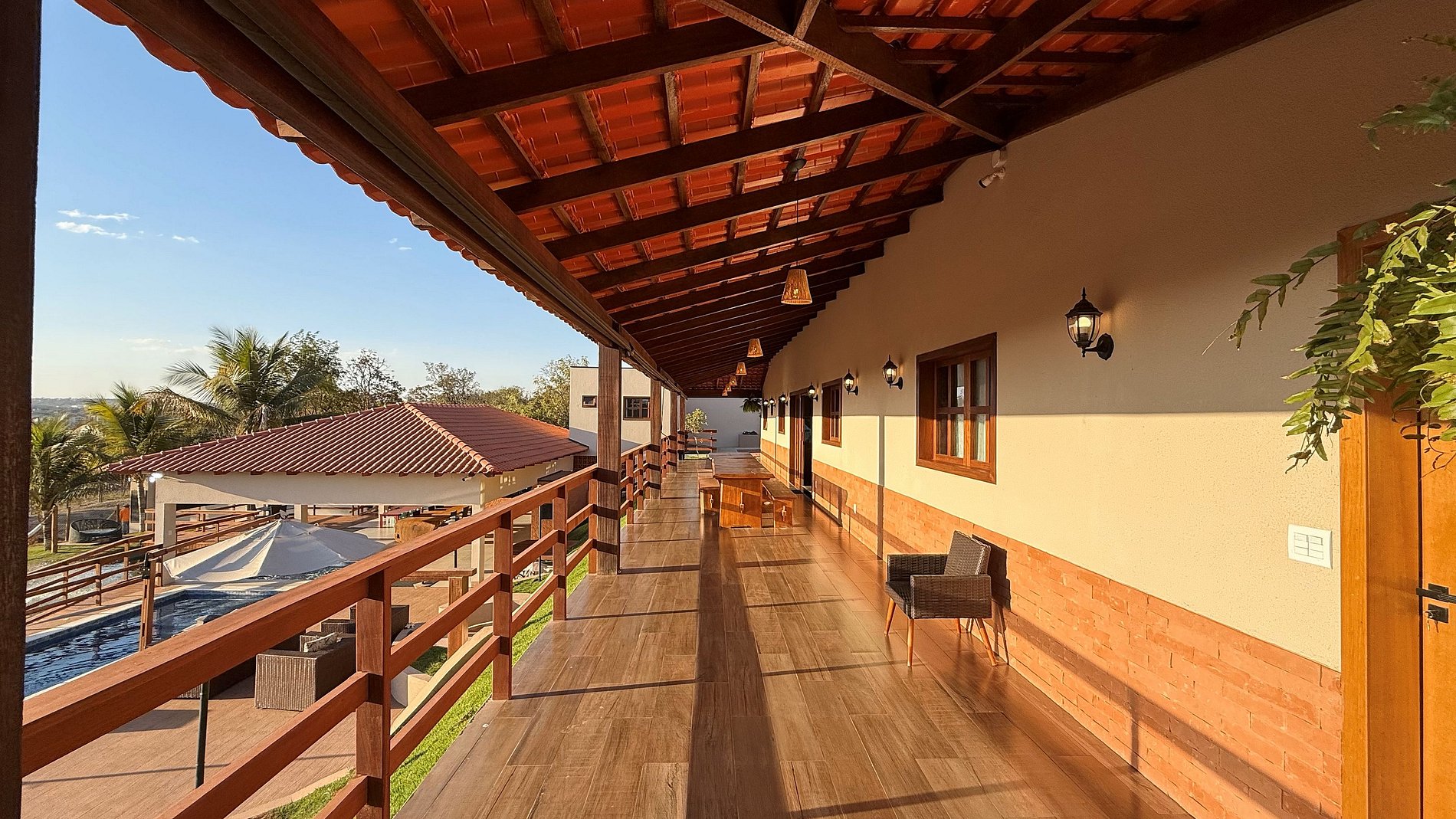 Ao lado da área gourmet, o deck se abre para uma vista panorâmica de tirar o fôlego, com o Lago Corumbá e a cidade de Caldas Novas ao fundo – cenário perfeito para refeições ao ar livre e bons momentos em grupo. O espaço gourmet é amplo e completo: conta com churrasqueira com espetos e grelha, fogão a lenha e industrial, forno, freezer, geladeiras, mesas grandes (inclusive infantil), poltronas e ombrelones. Tudo pensado para proporcionar conforto, praticidade e integração entre os hóspedes.