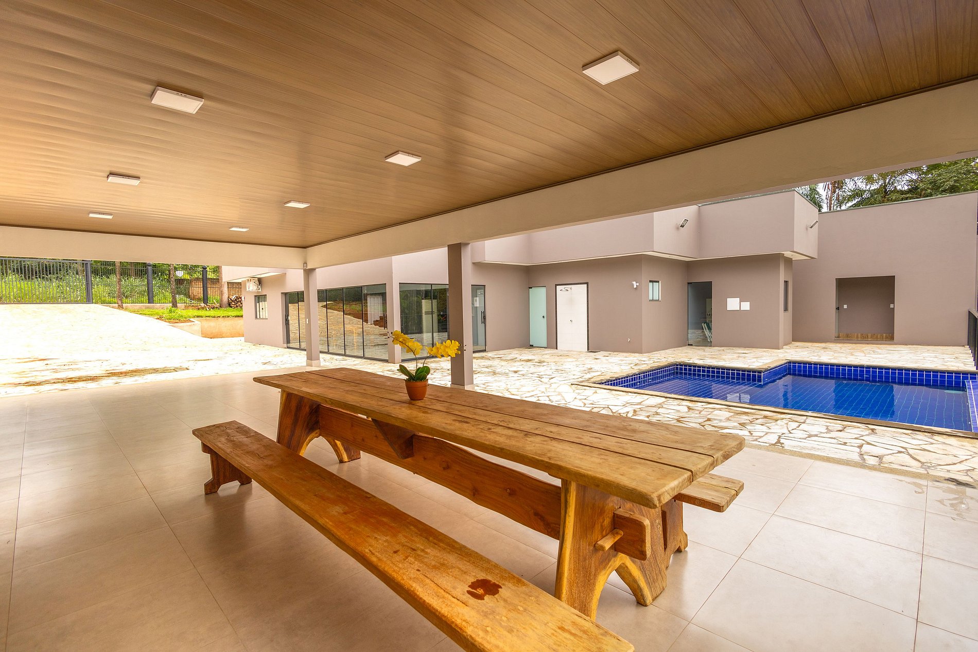 - Segurança reforçada com alarme e portão eletrônico.