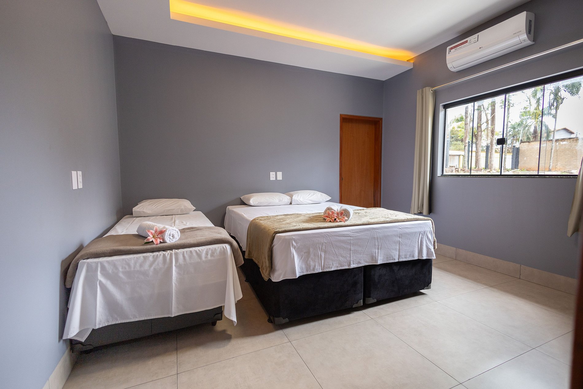 A hospedagem foi sensacional, principalmente, por estar muito bem localizada. Fica na entrada de Caldas Novas, próximo aos atacadões Assaí e Dia a Dia e outros comércios menores, pontos de referências fáceis de visualizar. Em avaliação anterior, vi uma reclamação acerca de defeito nos aparelhos de ar condicionado, mas, fui informado se tratar de um problema pontual e já solucionado. O que constatei ao chegar no local. Tudo funcionando. O local é perfeito. Boa localização, asfalto até a entrada, ótimas acomodações, piscina aquecida com borda infinita, áreas amplas, redário, churrasqueira, local arborizado, com vistas para uma APA. Harmonia total entre flora e fauna. Tivemos a grata satisfação de ver araras, micos, macacos Bugios, saracuras e outras espécies de pássaros, enfim, um clima de sossego e fazenda, dentro da cidade. Local perfeito para quem busca descanso com qualidade e, ao mesmo tempo, reunir familiares e amigos. O nosso Grupo de Motociclistas adorou já pretende retornar.
