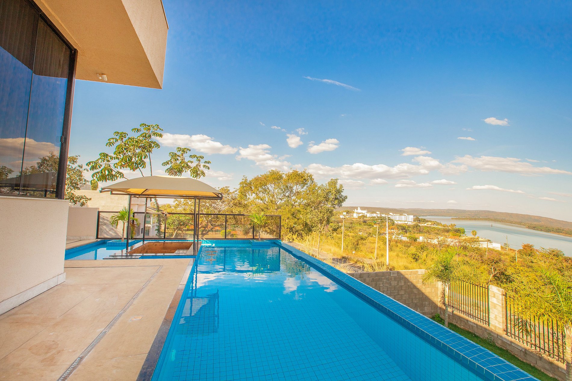 Essa ampla casa possui conceito aberto com uma espaçosa sala com mesa de sinuca anexa a completa cozinha, com todos os utensílios necessários para você preparar suas refeições e também uma churrasqueira. Dentro da área da cozinha e também na área externa, mesas de jantar para reunir toda a família ou amigos. A piscina da casa é um charme, com borda infinita, espreguiçadeira, guarda-sól. Destaque também para o bar molhado na piscina, para você preparar seus drinks. Seja da sala, da cozinha, da suíte master ou se deliciando na piscina de borda infinita, a vista que a casa oferece para o Lago Corumbá é de tirar o fôlego e renovar as energias.