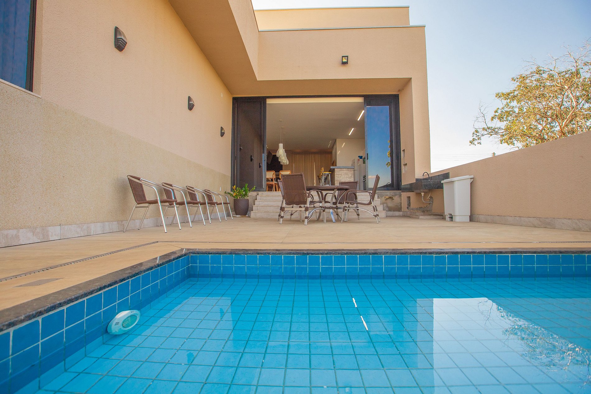 Nós estávamos em 09 adultos e 01 criança, ficamos 05 dias nesta casa. A casa de modo geral falando é maravilhosa e confortável. A Pisicna estava com água morninha. Possui todos os utensílios de cozinha necessários, lancheira, liquidificador, airfreyer, microondas, itens para churrasco, geladeira, freezer, fogão, etc. Forros de cama confortáveis, cama confortável. Necessita de alguma manutenção no ar condicionado e na energia. A energia caiu algumas vzs enquanto estávamos hospedados, mas tivemos assistência total da locadora e deu tudo certo. Está localizada em uma área bastante afastada do centro, mas é um local tranquilo e tem uma vista muito bonita para o lago Corumbá. Com certeza ficaria novamente nesta acomodação. Nós amamos.