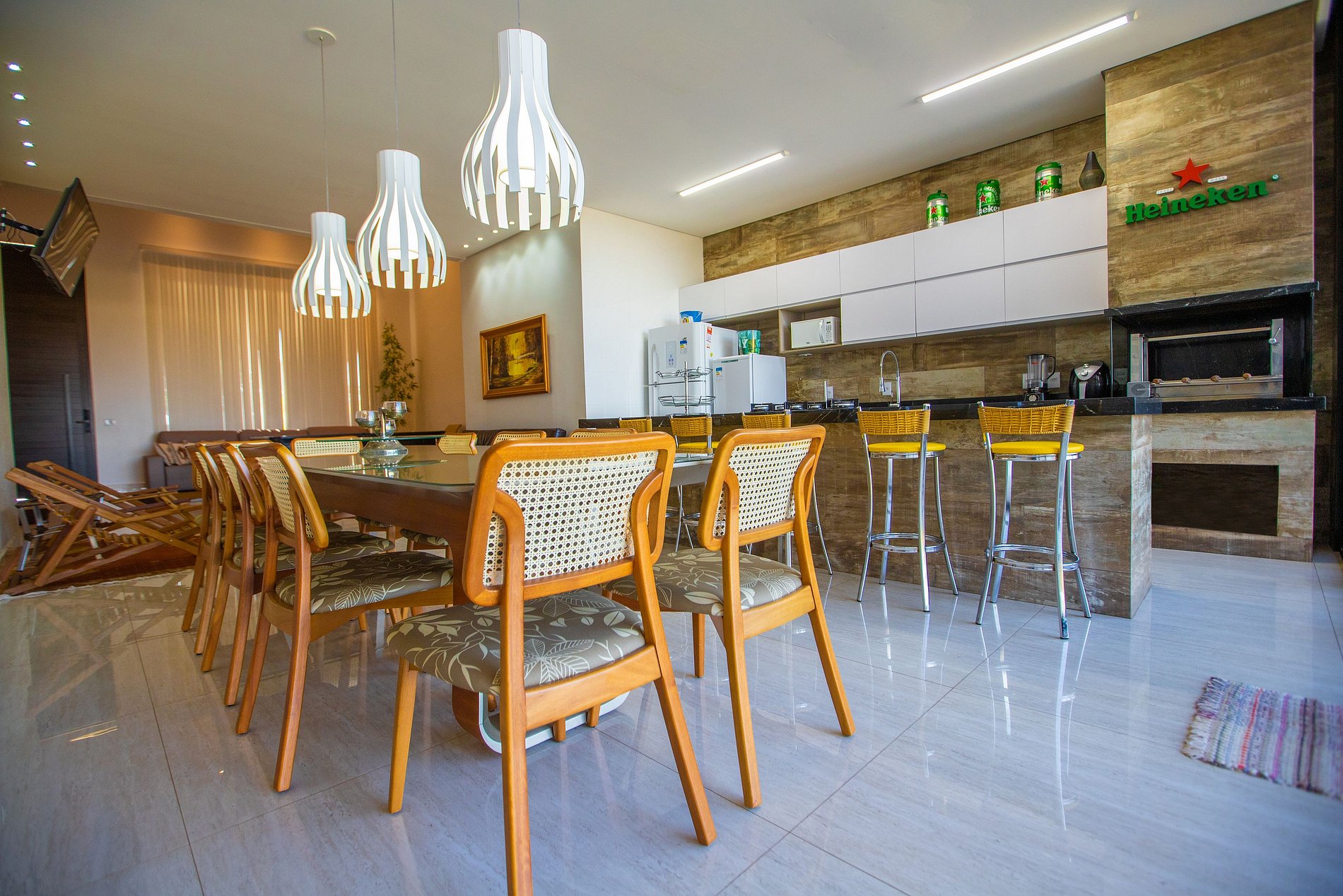 Possui todos os utensílios de cozinha necessários, lancheira, liquidificador, airfreyer, microondas, itens para churrasco, geladeira, freezer, fogão, etc.