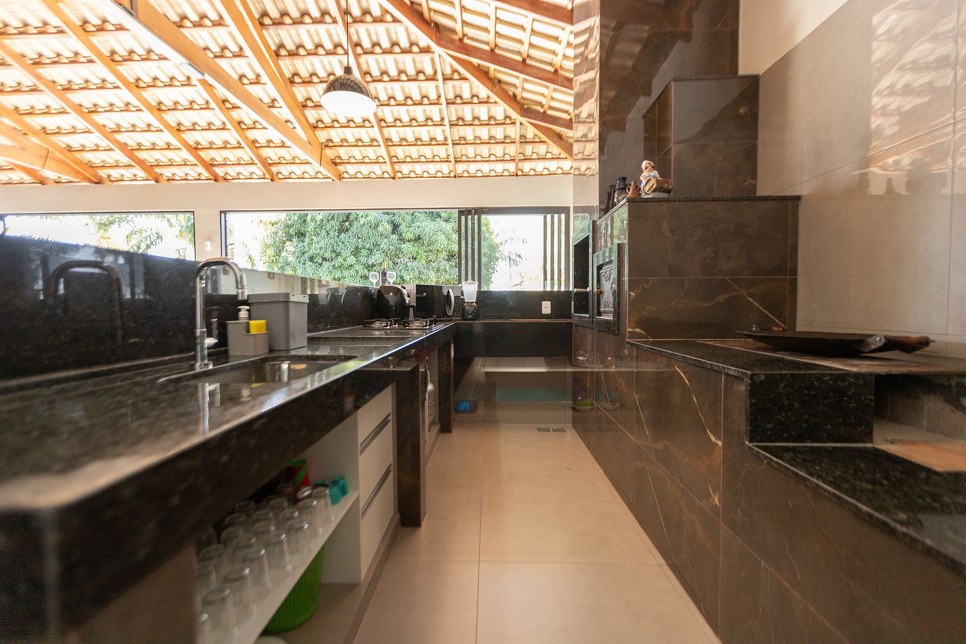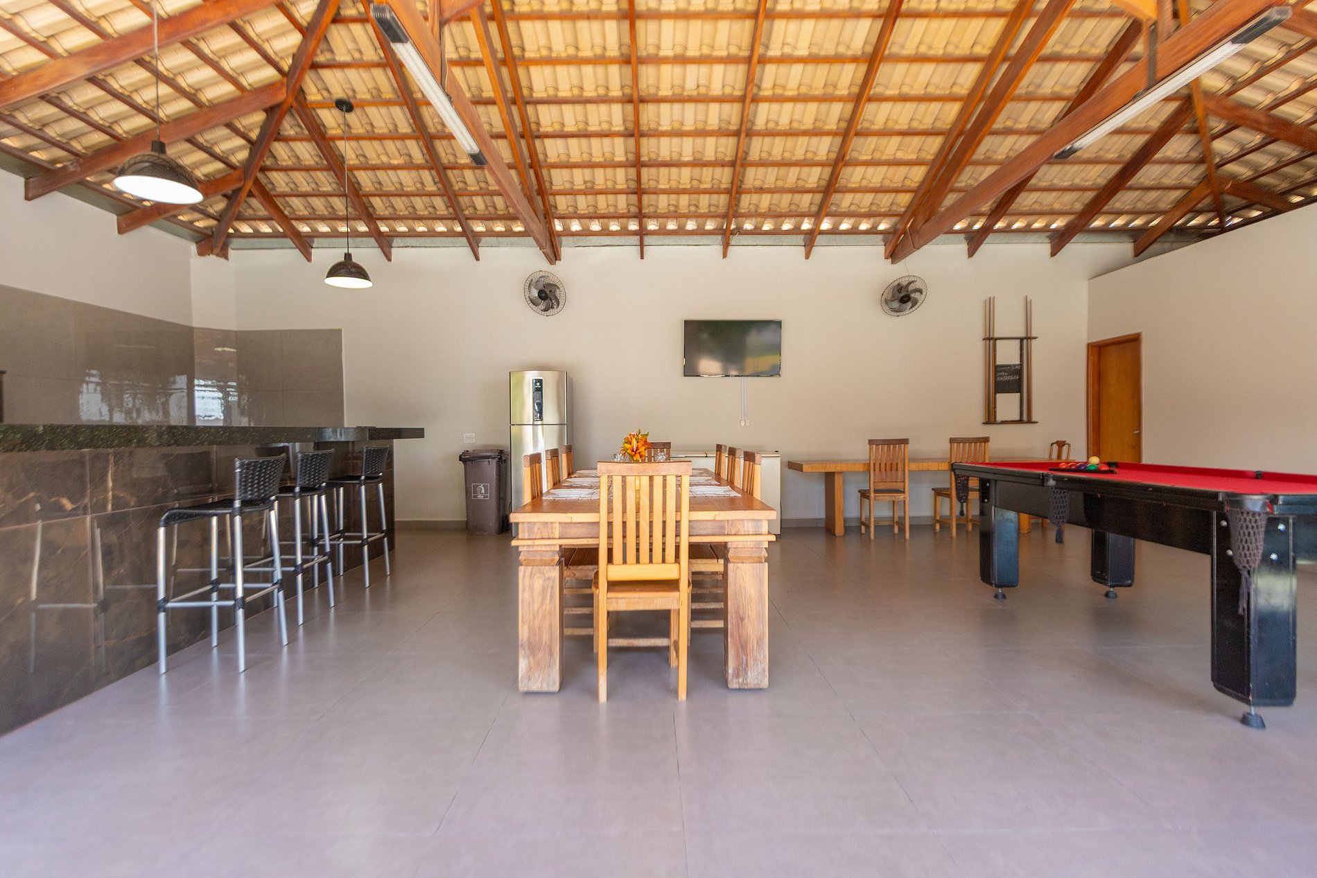 Imagine um lugar onde cada detalhe foi pensado para proporcionar momentos inesquecíveis de lazer e descanso. A área gourmet é um verdadeiro paraíso para os amantes da culinária e do convívio social. Com bancadas espaçosas, confortáveis cadeiras e mesas, além de freezers e um refrigerador para manter suas bebidas sempre geladas, cada refeição será um banquete. A churrasqueira convida a preparar deliciosos churrascos, enquanto a TV e a mesa de sinuca garantem que a diversão continue noite adentro. Dentro de casa, uma cozinha totalmente equipada espera por você. Com mesa, fogão, micro-ondas, forno elétrico e todos os utensílios necessários, como panelas, pratos e talheres, você terá tudo o que precisa para preparar suas refeições favoritas.