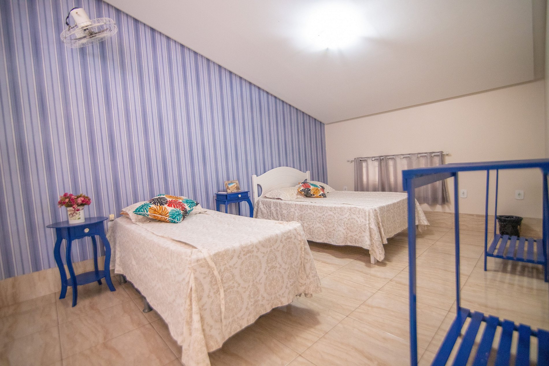 - Acomodação para até 15 pessoas! Sendo um quarto duplo com banheiro no andar superior (acessado por escada) e duas suítes e um quarto no andar térreo.