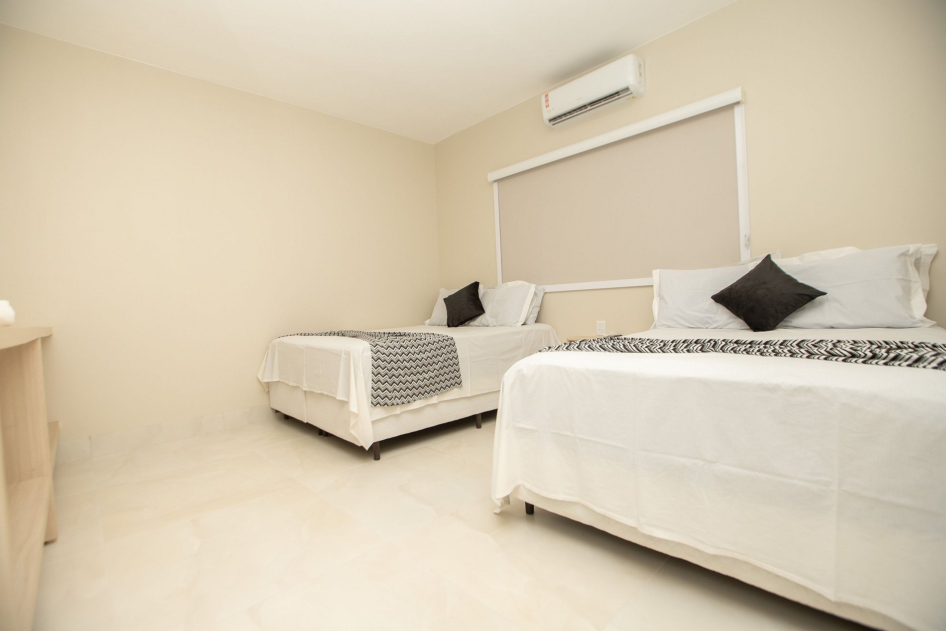 - A casa possui 4 suítes família, cada uma equipada com duas camas de casal, ar-condicionado e TV, acomodando até 16 pessoas. Uma das suítes foi projetada para acessibilidade de pessoas com deficiência (PCD). Além disso, fornecemos um colchão de casal extra, e o sofá-cama da sala pode acomodar até duas pessoas.