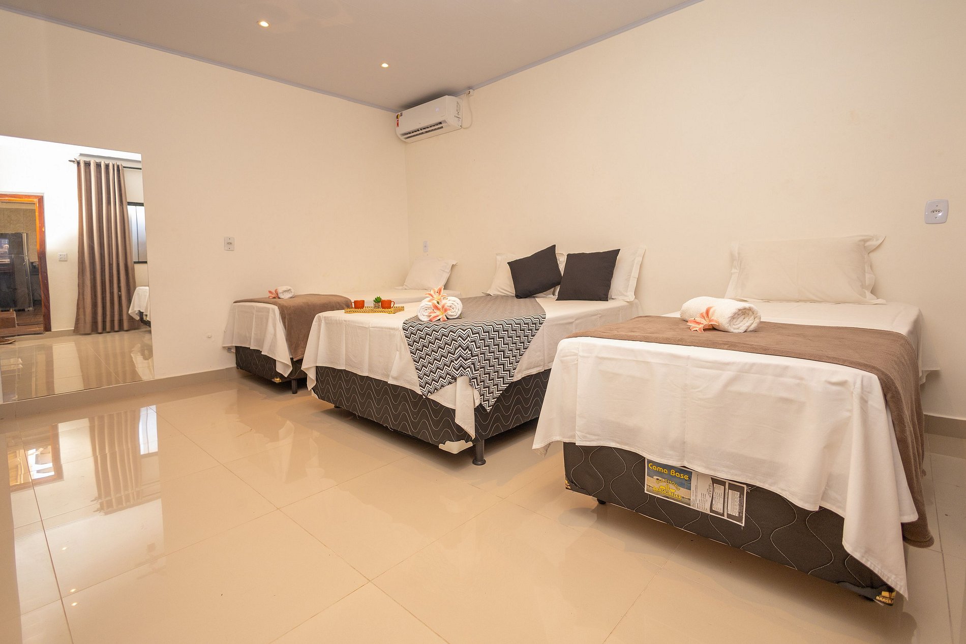 - A casa possui 4 quartos, sendo uma suíte, todos com tv e ar condicionado. Ao todo, fornecemos acomodação para 18 pessoas em camas e colchões individuais.
