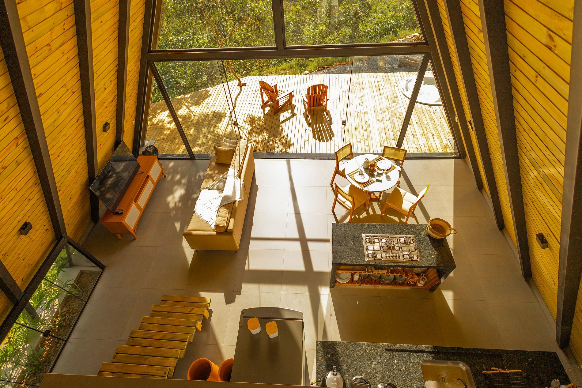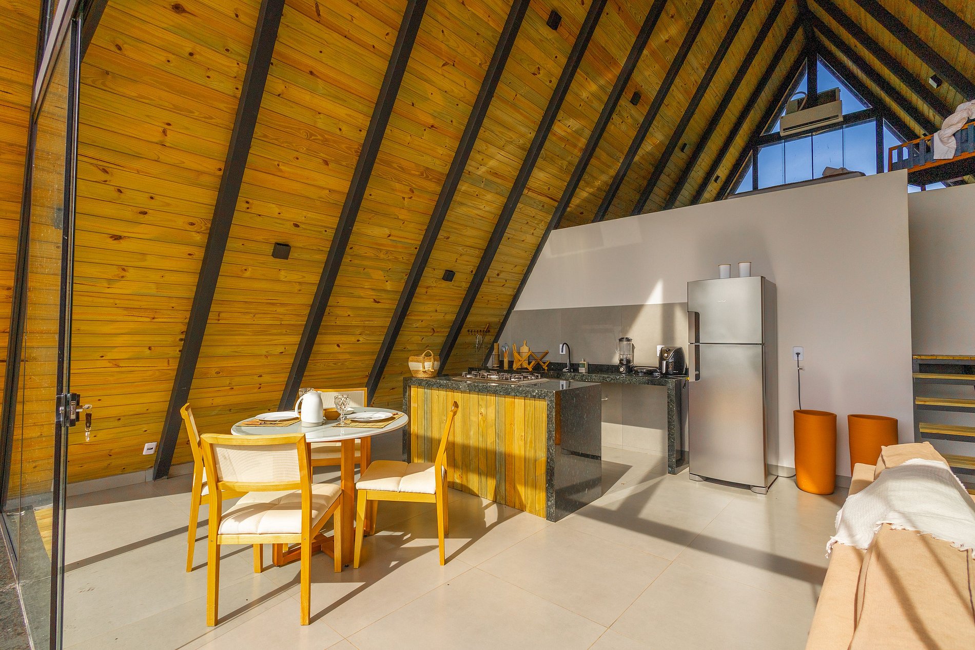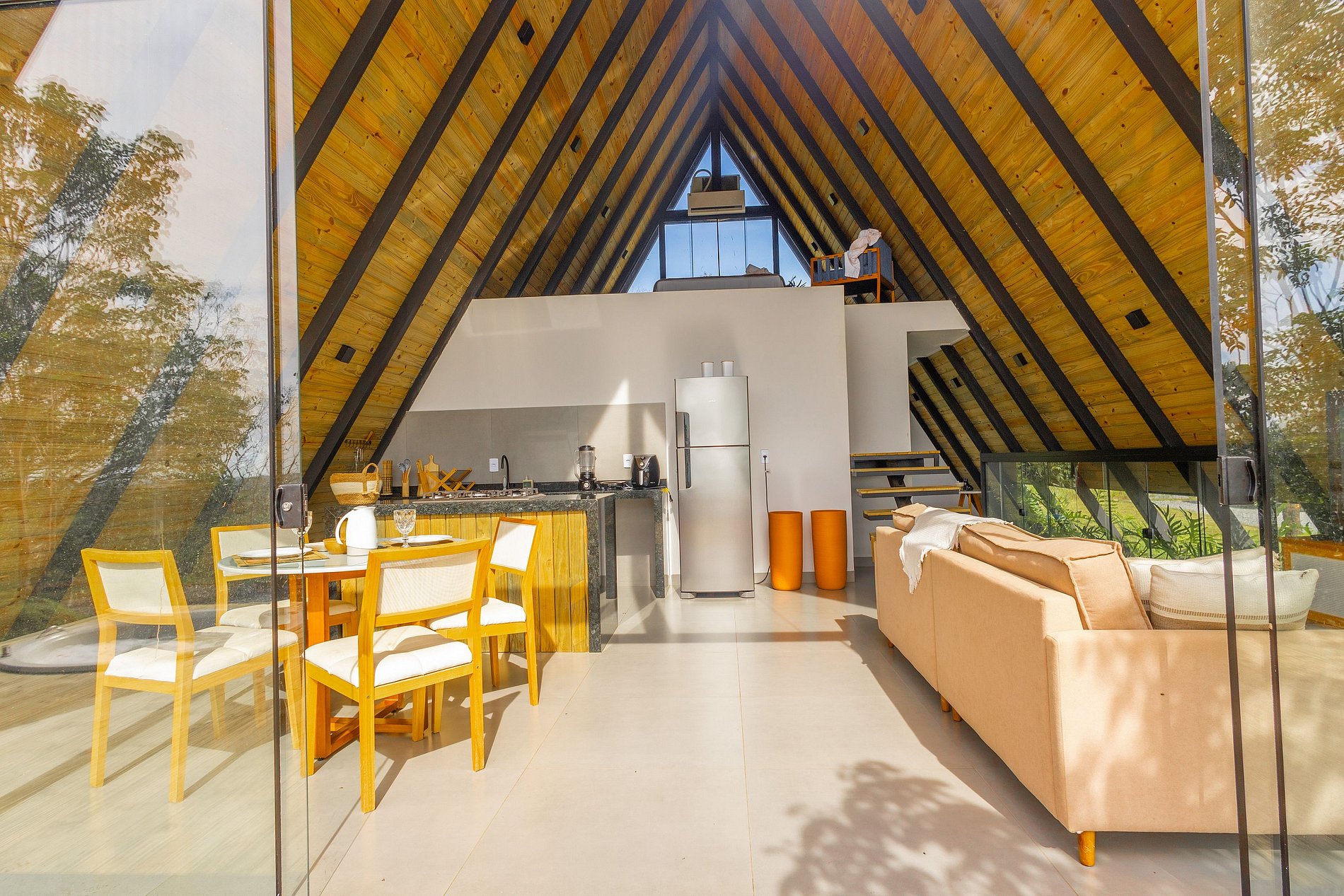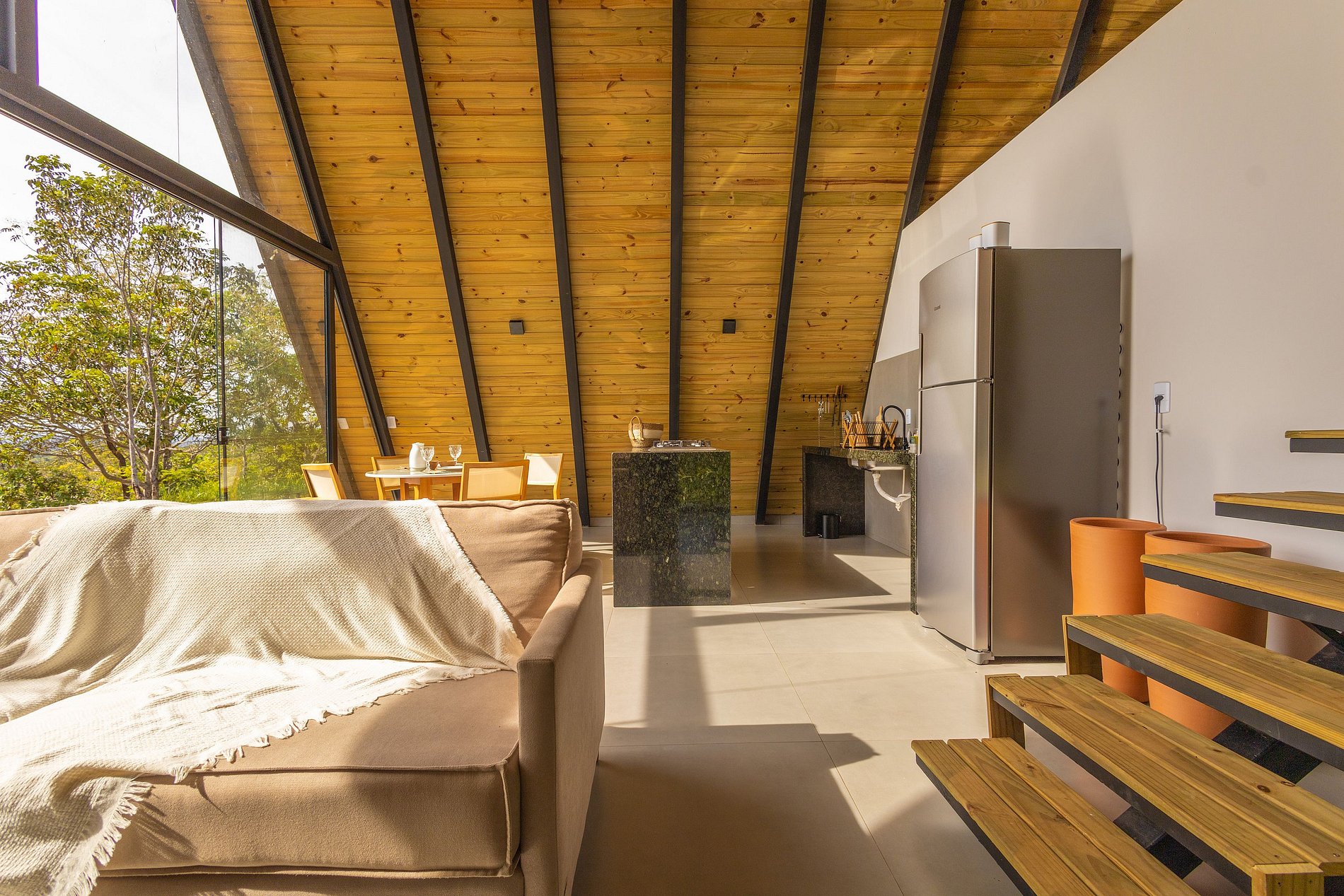 A cozinha da cabana é equipada com fogão, geladeira, air-fryer e sanduicheira. A sala de estar é um convite para o descanso, com um sofá confortável, smart tv e janelas amplas que integram a luz natural e a paisagem ao ambiente. Cada detalhe foi cuidadosamente pensado para criar um espaço que acolhe e encanta.