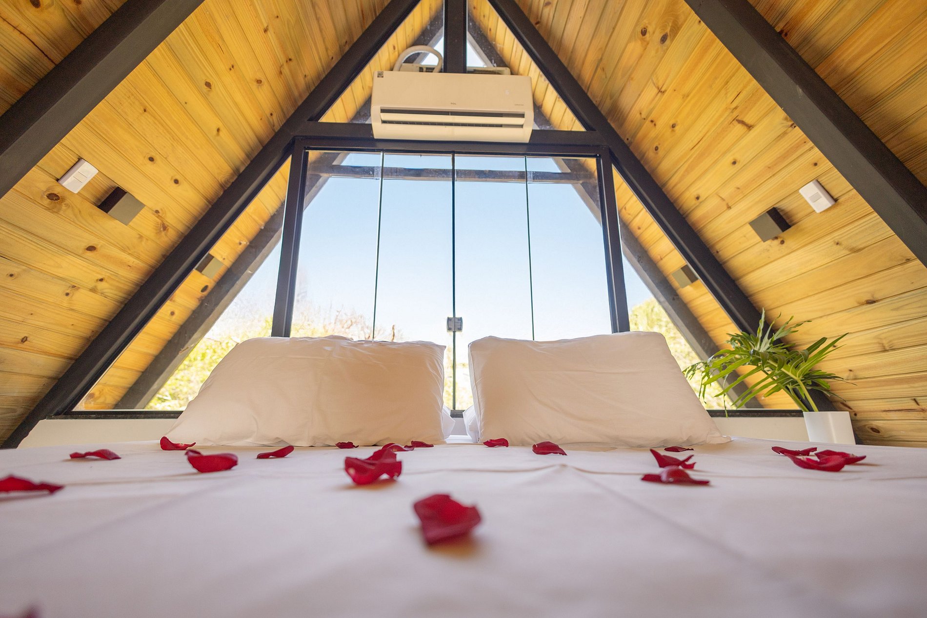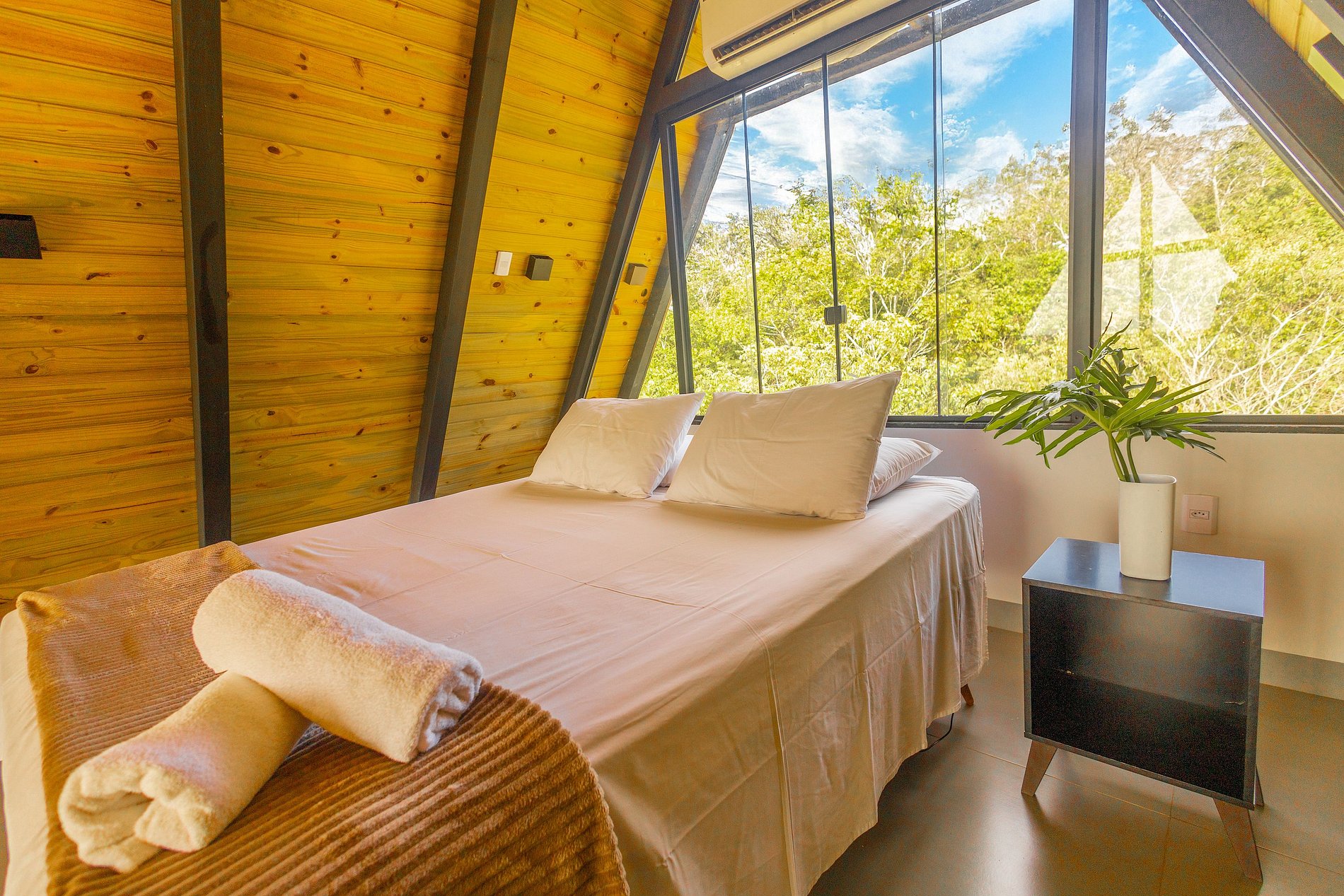 No interior da cabana, o quarto de casal foi pensado para garantir conforto absoluto com ambiente é climatizado com ar-condicionado. A decoração charmosa cria uma atmosfera acolhedora, ideal para quem busca um clima romântico e intimista.
