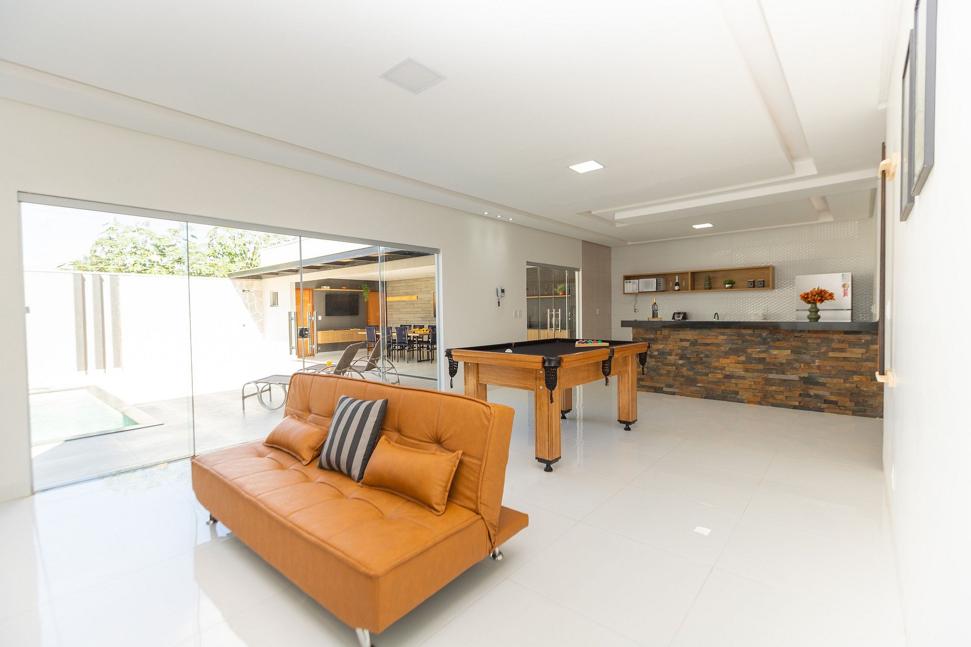 Esta casa foi planejada especialmente para receber hóspedes que valorizam conforto, praticidade e momentos de lazer em um só lugar. O grande destaque fica por conta da área de lazer, que possui um conceito totalmente integrado com a sala, a cozinha e a área gourmet. Um ambiente amplo, arejado e acolhedor, onde todos podem estar juntos, seja preparando uma refeição, relaxando na piscina ou jogando uma partida de sinuca. A piscina privativa conta com aquecimento solar, garantindo diversão em qualquer horário do dia. Ao lado, a área gourmet é equipada com churrasqueira, bancada de apoio, TV, mesa para refeições ao ar livre e espreguiçadeiras para quem quiser aproveitar o sol ou apenas descansar após um banho de piscina.