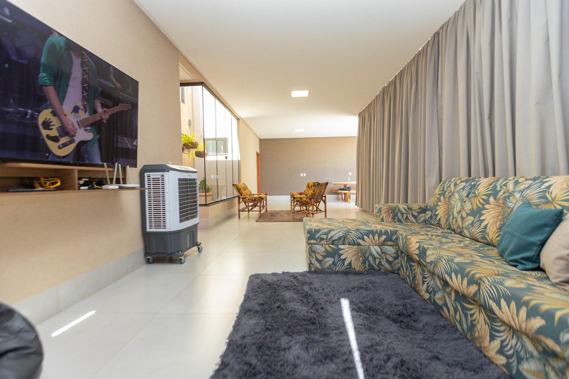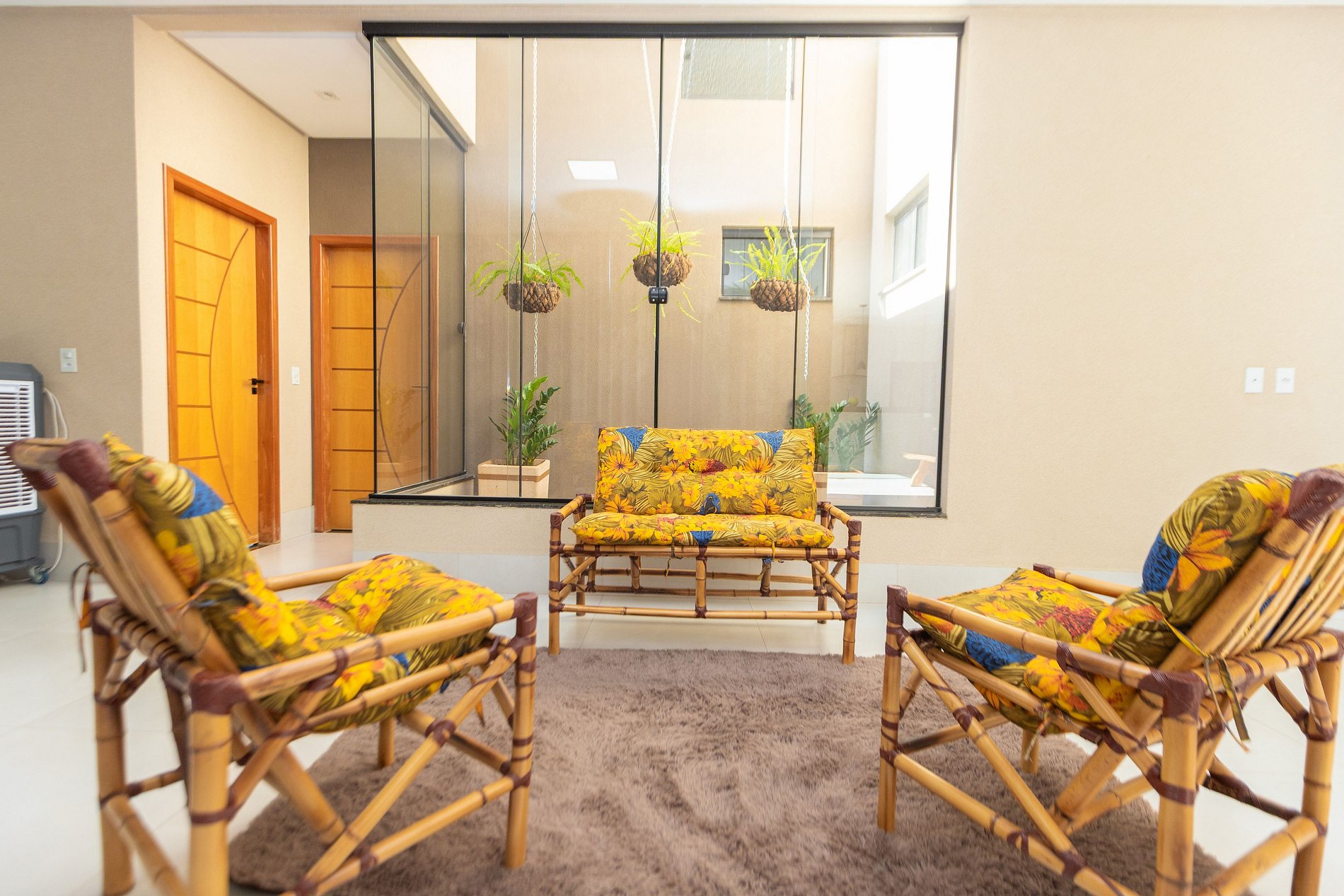 Dentro da casa, o conforto é prioridade. Uma sala aconchegante com smart TV e poltronas conecta-se ao ambiente externo em um charmoso conceito aberto, perfeito para momentos de convivência. A sala dispõe ainda de uma ampla mesa de jantar e uma cozinha completa, equipada com todos os utensílios necessários para preparar refeições deliciosas. Tudo foi pensado para proporcionar uma experiência inesquecível!